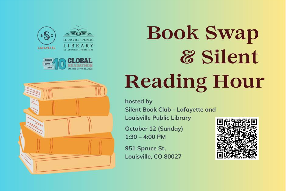 If your bookshelf is overflowing (or you’re just looking for something new to read), join us for a fun and low-key Book Swap & Silent Reading Hour hosted in collaboration with the Louisville Public Library. We’ll be gathering on October 12 (Sunday) from 1:30–4:00 PM at the Louisville Public Library.