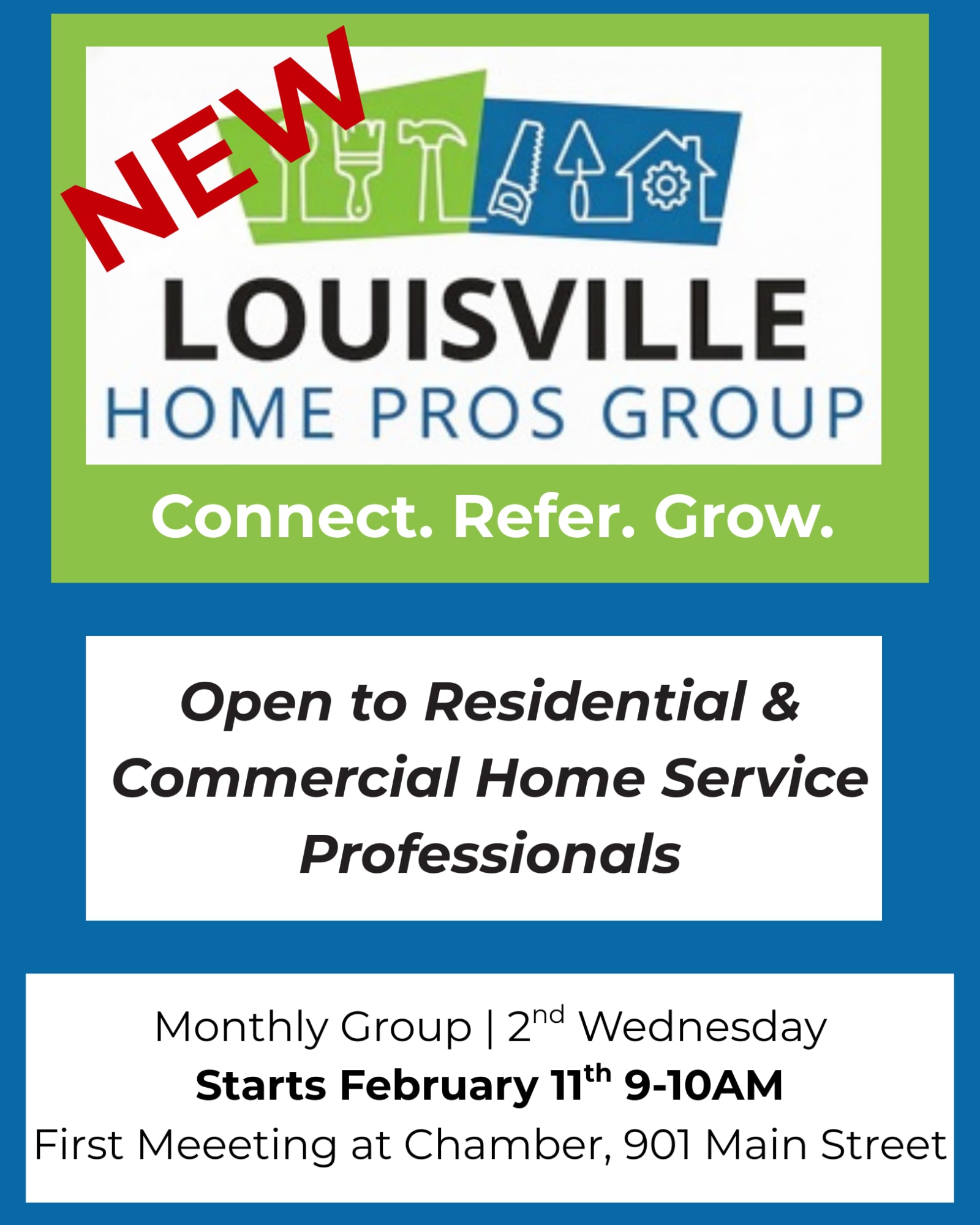 New this February, Louisville Chamber Home Pros is launching as a monthly networking group for home and commercial service professionals. The first meeting will be held at the Chamber office, with ongoing location to follow. If you value real connections, referrals, and shared expertise, this group is for you.