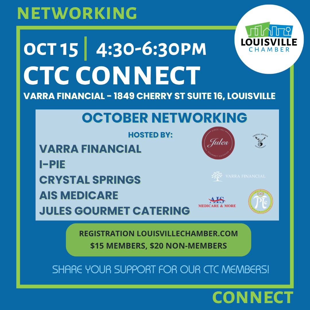 October Networking Event! Celebrating Our CTC Members Hosted by CTC Members: Varra Financial, I-Pie Pizza, Crystal Springs Brewing & AIS Medicare & Jules Gourmet Catering