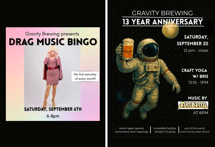 | September Events! 1150 Pine St. Drag Music BingoSeptember 6th, 6-8pmWe're hosting Drag Music Bingo with Jill Literate, the first Saturday of every month! Between each round of music bingo, watch Jill perform an incredible dance number, munch on some pizza from Double D's, and try one of our 15+ beers on tap. The event is free and open to all ages, so don't hesitate to join in on the fun, compete for prizes, and watch the performance of a lifetime! Gravity Brewing 13 Year Anniversary Party September 20th, 12pm-CloseWe're hosting our 13th Anniversary Party at Gravity Brewing! There will be free craft yoga (12:15-1pm), live music by Full Belly at 6pm, incredible food by Double D's pizza, and special, barrel aged beer tappings! Swing by anytime after 12pm for out of this world community, beer, music and fun. @thegravitybrewing / thegravitybrewing.com / 303-544-0746 |