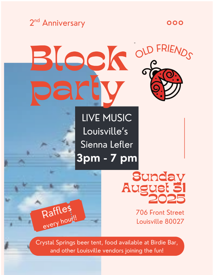 | Old Friends Block Party! August 31st 3-7pm 706 Front St. Don’t miss our Old Friends (2.0) 2nd Anniversary Block Party! Featuring food, libations, live music from local musician Siena Lefler, vendors, raffles every hour, and all-around fun! It was so much fun last year we just had to do it again!
