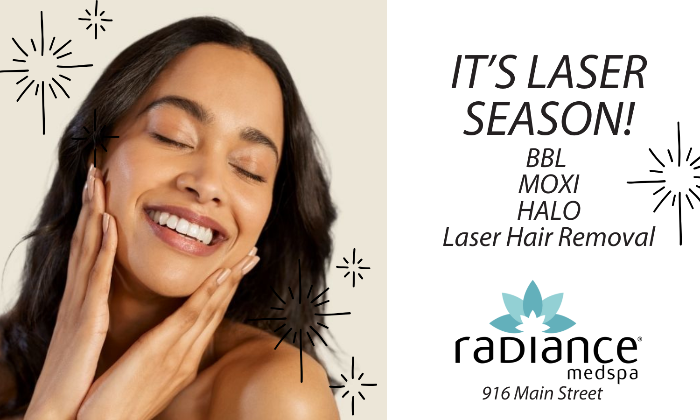 | Laser Season at Radiance! 916 Main Street Fall is the perfect time to refresh your skin and let your natural beauty shine. Our advanced aesthetic lasers—like BBL, MOXI, Halo, and Laser Hair Removal—address everything from sun damage, brown spots, redness and rosacea to fine lines, large pores, loose skin, acne, scars, and unwanted hair. In other words, there’s a laser for pretty much everything!