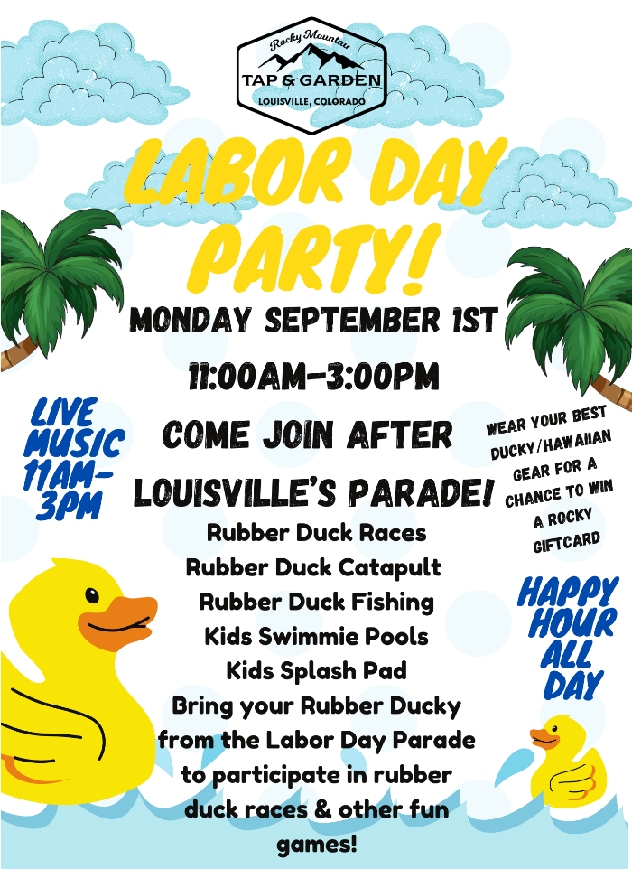 | Labor Day Splash & Quack Bash + 3rd Anniversary! September 1st 11am-3pm 1071 Courtesy Rd. You’re invited to Rocky’s Labor Day Splash & Quack Bash + 3rd Anniversary Party! Come celebrate with us at Rocky Mountain Tap & Garden on Monday, September 1st from 11:00AM–3:00PM right after the Louisville Labor Day Parade!