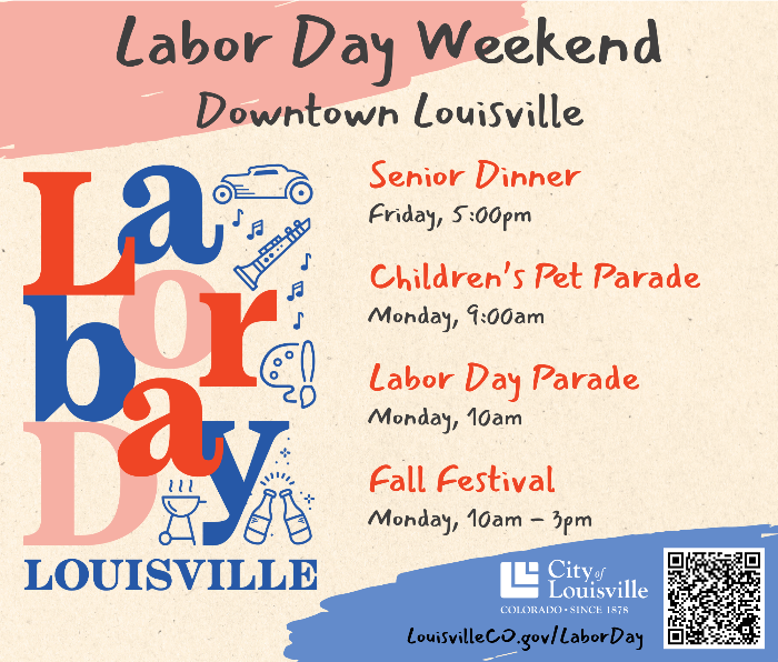 | Fall Festival and Labor Day Parade!Don’t miss Louisville’s Annual Labor Day Parade and Fall Festival! The festivities begin at 9am on Main Street with the Pet Parade - bring your non-human bestie and strut your stuff! The Labor Day Parade kicks off at 10am immediately following the Pet Parade, so come downtown early and score your spot along the street.