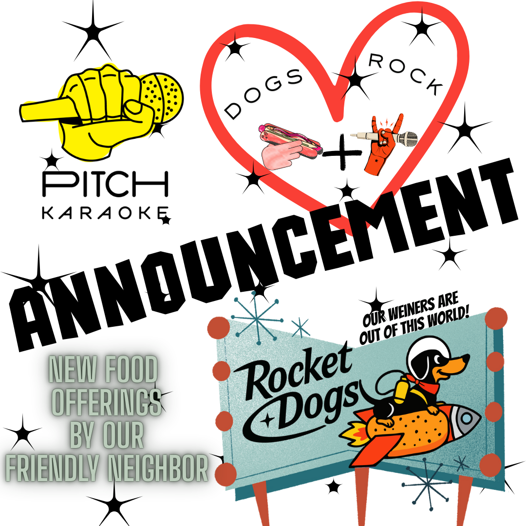 | Pitch + Rocket Dogs! 640 Main St. Unit C Pitch Karaoke is excited to announce the new partnership with Rocket Dogs!Feed your inner rockstar while singing with a gourmet hotdog, sandwich, salad, or yummy snack. The Pitch Karaoke team delivers food and drinks right to your private suite to keep the party going. Reserve your suite on www.pitchkaraoke.com |