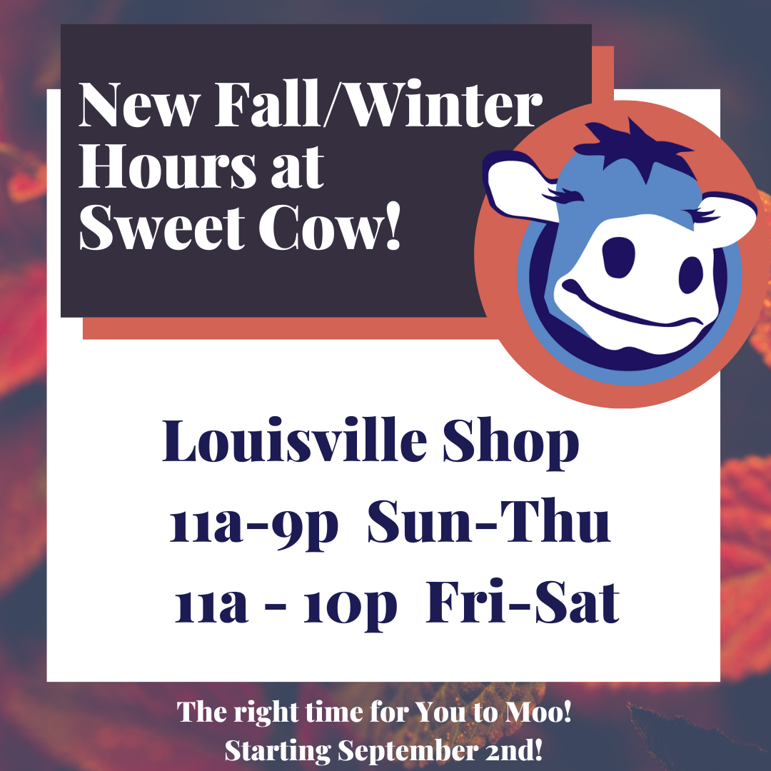 | Fall Hour at Sweet Cow! August 8th 637 Front St. Summer is winding down, and the beauty of autumn is just around the corner. As the kids head back to school, our hours will shift a little too. The days may grow shorter and the nights a little longer, but you can count on us to keep scooping smiles all season long. Come celebrate year-round with us at 637 Front St, Louisville 80027.