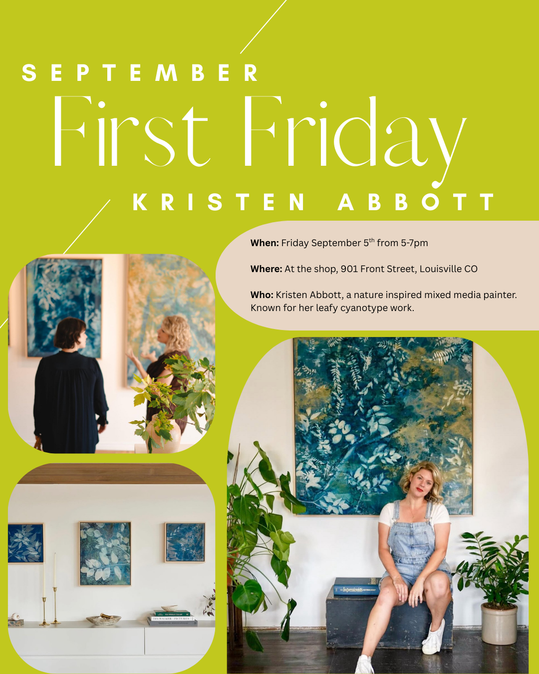 | EleanorFirst Friday September 5th 5-8pm 901 Front St., Ste 100 Join us for September First Friday and enjoy sips and shopping, featuring the work of Kristen Abbott in store!
